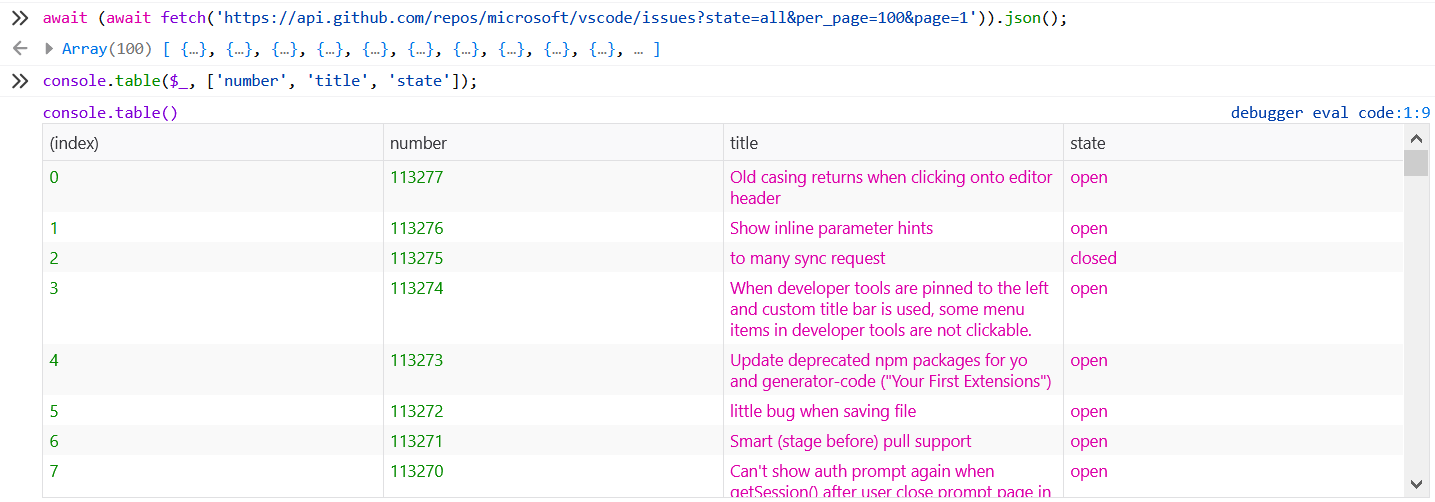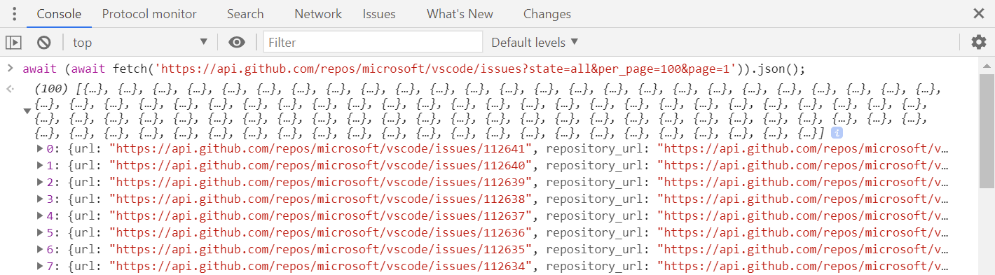 await (await fetch('https://api.github.com/repos/microsoft/vscode/issues?state=all&per_page=100&page=1')).json();