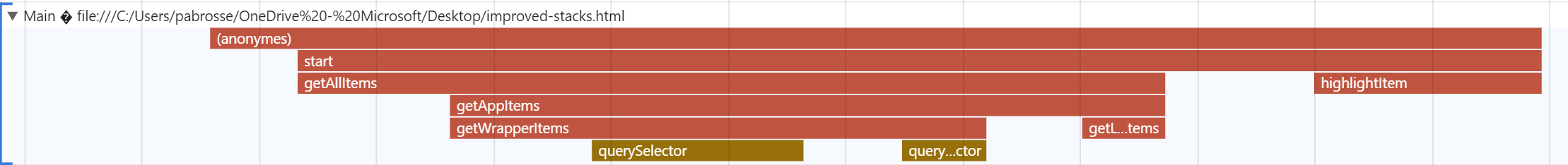 ![[Click to open image] Screenshot of part of a performance profile in Edge's Performance tool, showing a visual trace of the program execution Screenshot of part of a performance profile in Edge's Performance tool, showing a visual trace of the program execution](/assets/performance-profile.png)